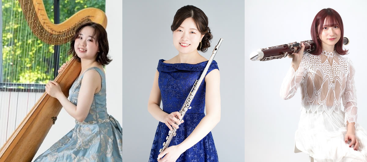 (左から)ハープの堀野瀬奈さん、フルートの新井志歩さん、ビオラの山縣由布夏さん