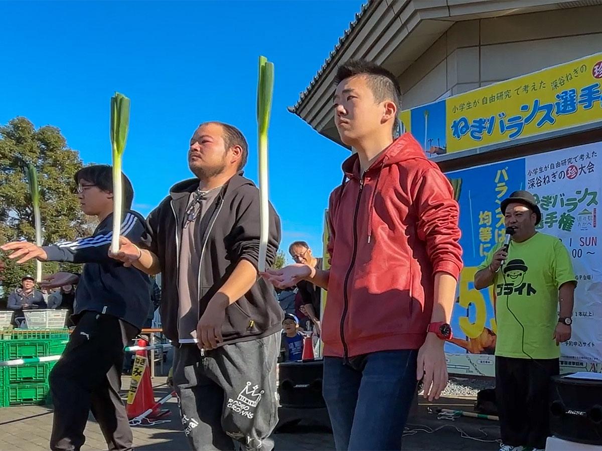 旬を迎えた「深谷ねぎ」を人さし指に乗せる珍競技「全日本深谷ねぎバランス選手権」