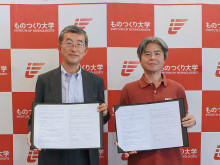 FMクマガヤとものつくり大学との覚書締結式。ものつくり大学理事長土屋喜久さん(左)とFMクマガヤの栗原謙一社長