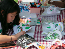 当日は朝から多くの親子連れでにぎわった。キッチンカーでは、子どもたちがスタッフ用エプロンを身に着けて注文を受けたり料理を運んだりする「お仕事体験」に挑戦。工作やクラフトワークショップには親子連れが集まり、作品作りや面の絵付けなどに取り組んだ。