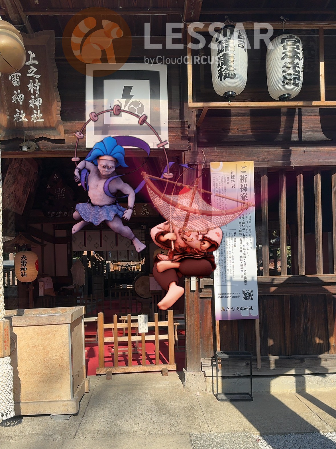 AR体験画像。数柱の神さまが舞い「商売繁盛」などの文字も浮かび上がる