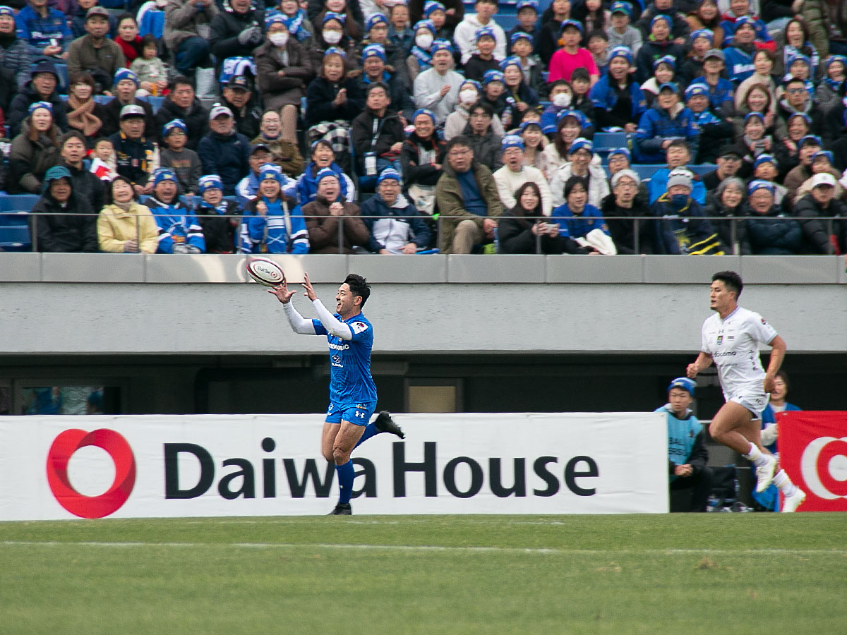 笑顔でキャッチし、トライゾーンへ走り込む竹山晃暉選手