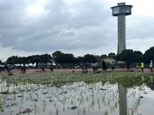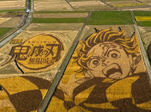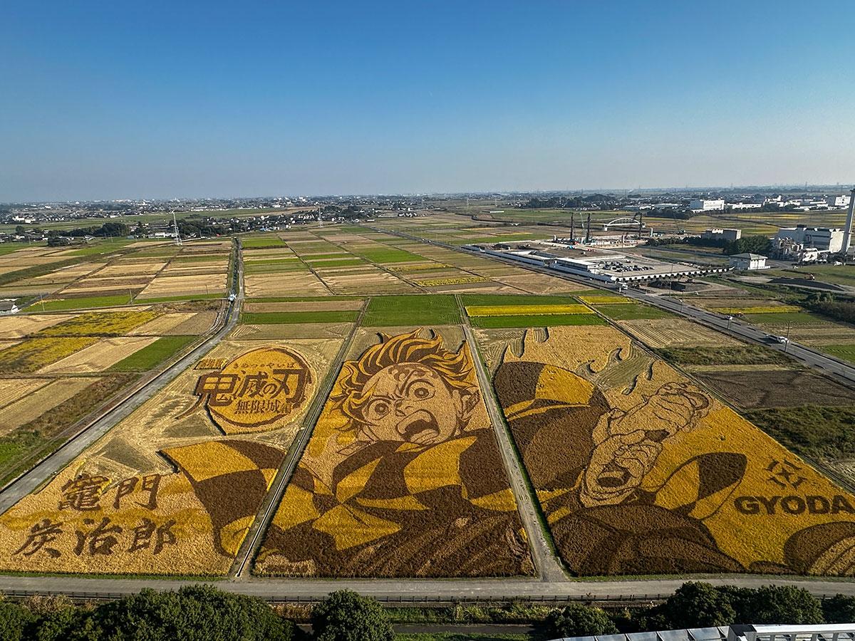 行田の「古代蓮(はす)の里」(行田市小針)東側にある田んぼアートが現在、黄金色に色づき、見頃を迎えている。