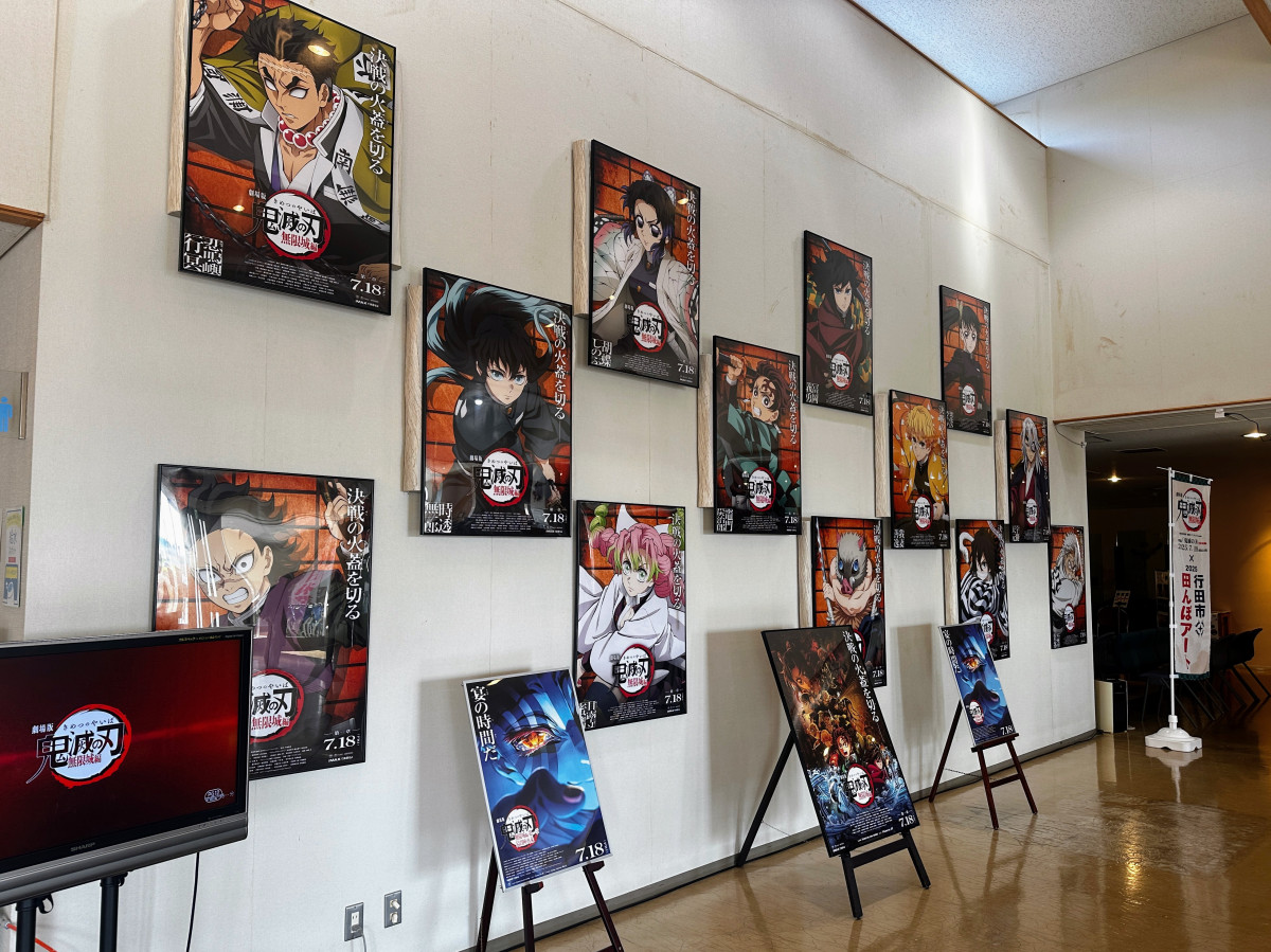 行田タワー(古代蓮会館)内。コラボしたアニメ「鬼滅の刃」のパネル展示やグッズ販売も