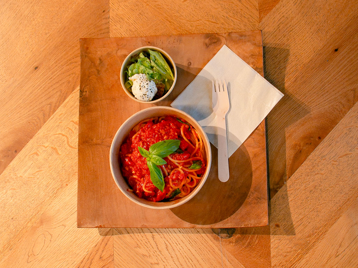 テイクアウトも可能。トマトとバジルのパスタ
