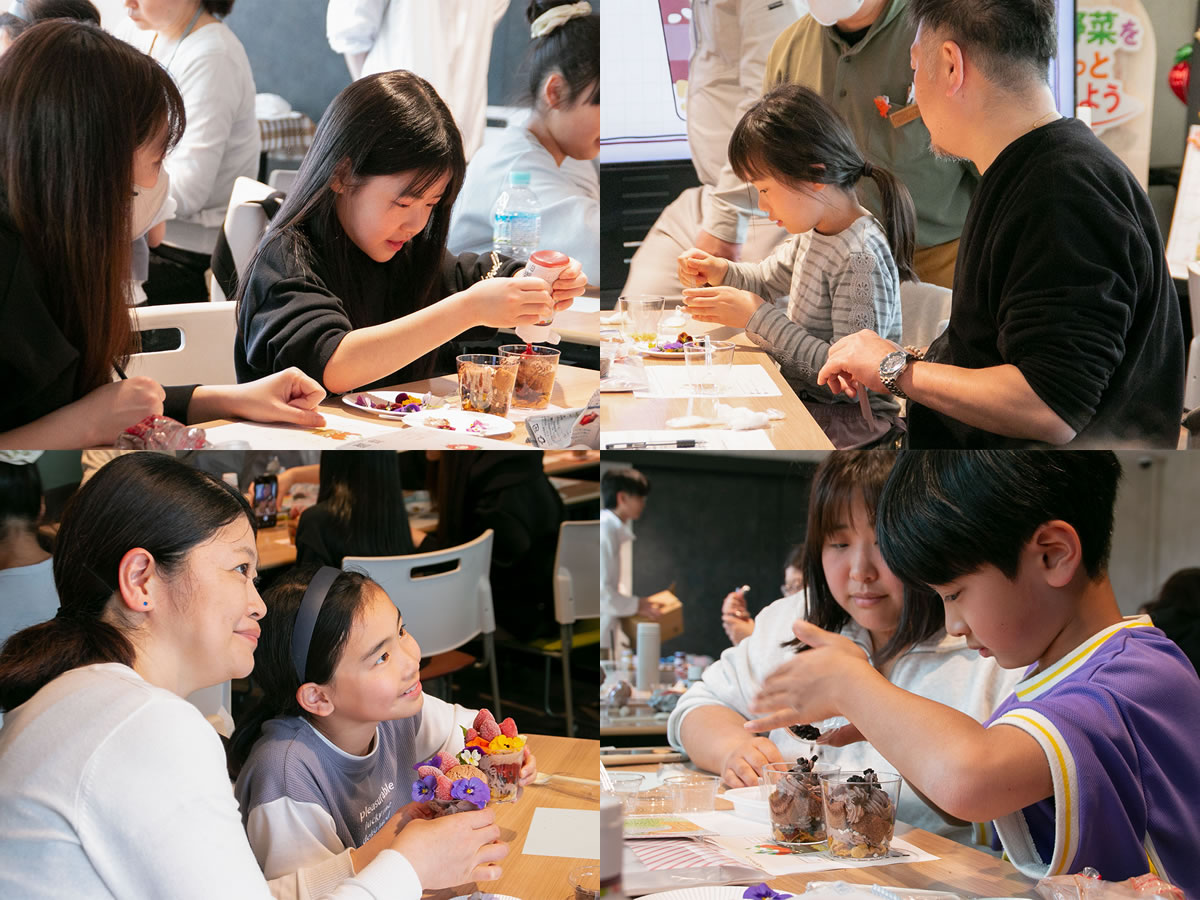 イチゴのプランターをイメージした特製パフェ作りに挑戦する参加者