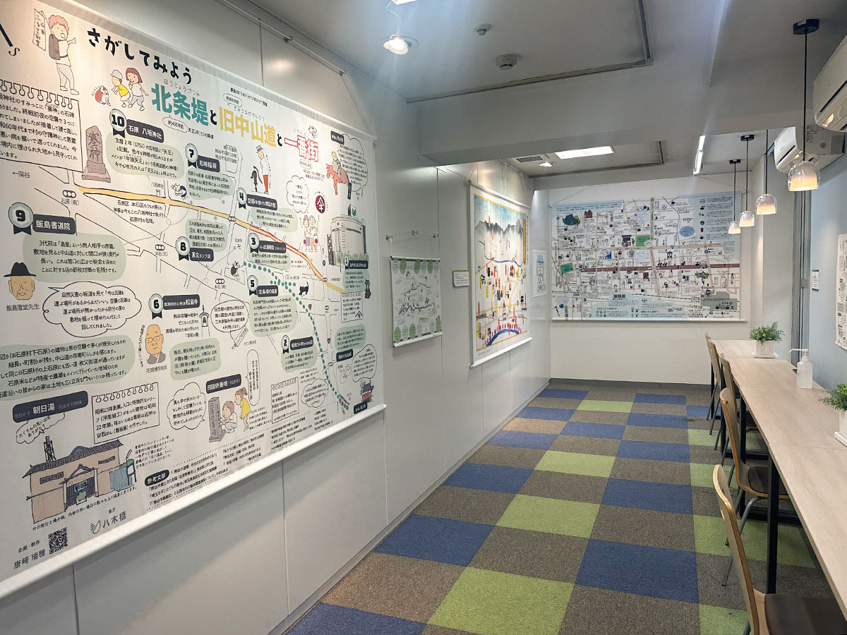 「さがしてみよう北条堤と旧中山道と一番街」「熊谷川沿いお散歩マップ」など唐崎さんの作品が並ぶ八木橋百貨店8階の休憩スペース