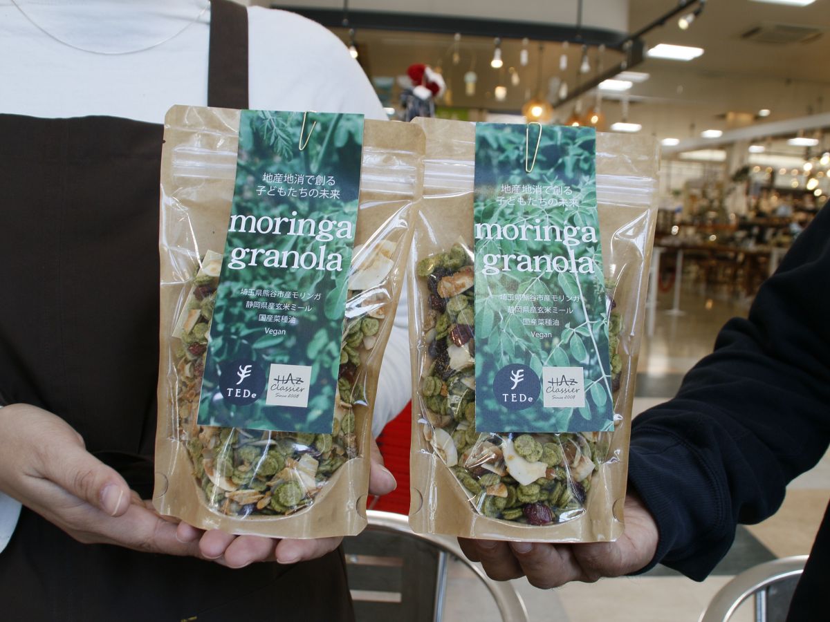 「求めていたグラノーラが完成した」と恩田店長が勧めるハーズクラシエオリジナル商品「モリンガグラノーラ」。熊谷産モリンガ、自然栽培の玄米ミール、米澤製油の国産菜種油など、なるべく近くにある材料を使うことにこだわった気軽におやつみたいに口に放り込んでほしいという