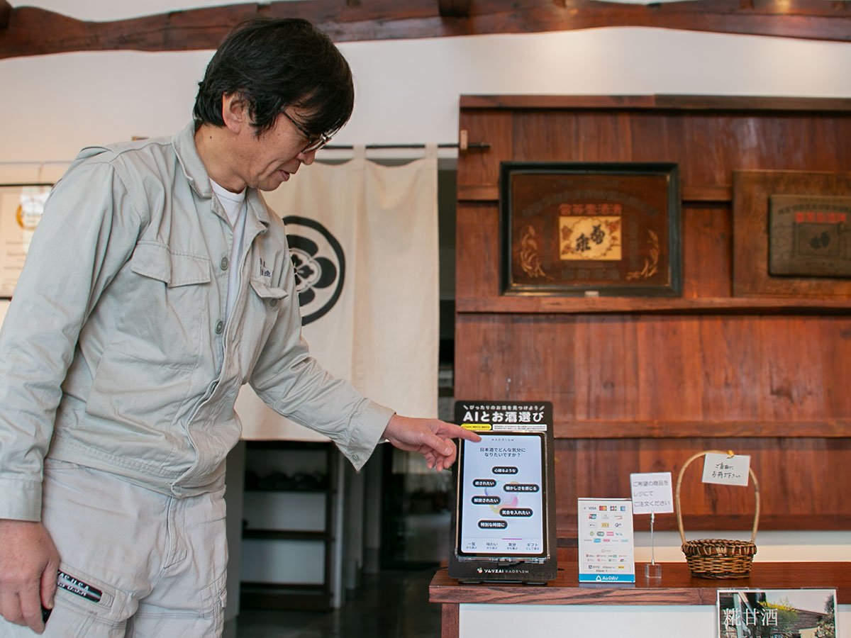 お客さまが好みの味わいや気分をタップすると、AIが店頭にある日本酒の中からおすすめを提案するタッチパネルも設置
