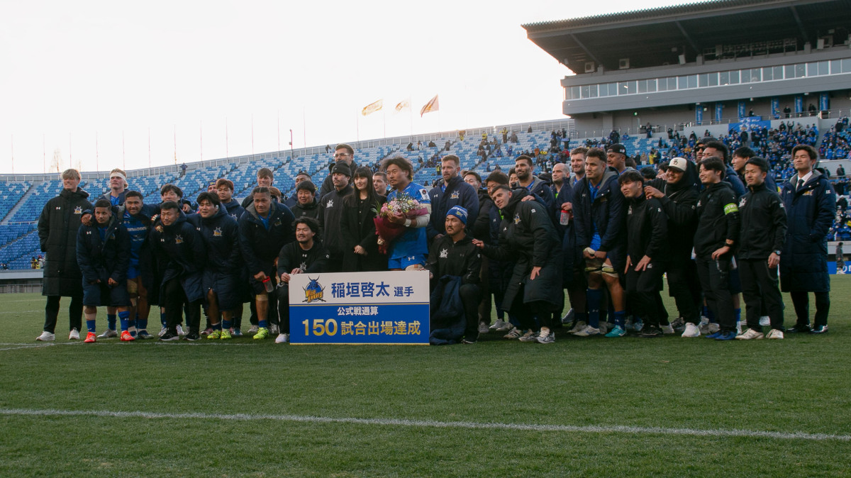公式戦通算150試合出場達成を稲垣啓太選手を祝うチームメートら