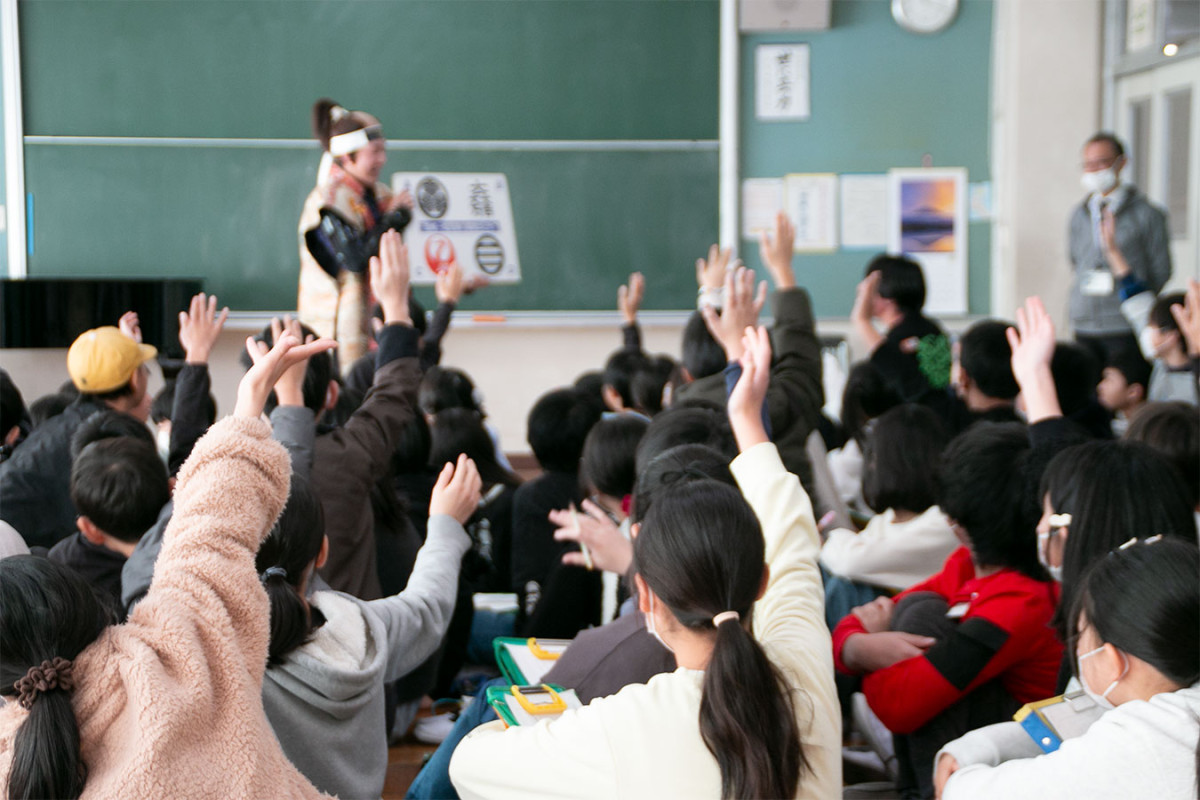 質問コーナーでは「水攻めってどんなだったの」「(成田長親が)侍をやめてお坊さんになったのはなぜ」「腰に着けた短い刀は何に使うの」などさまざま聞かれ、教室は終始活気に包まれた