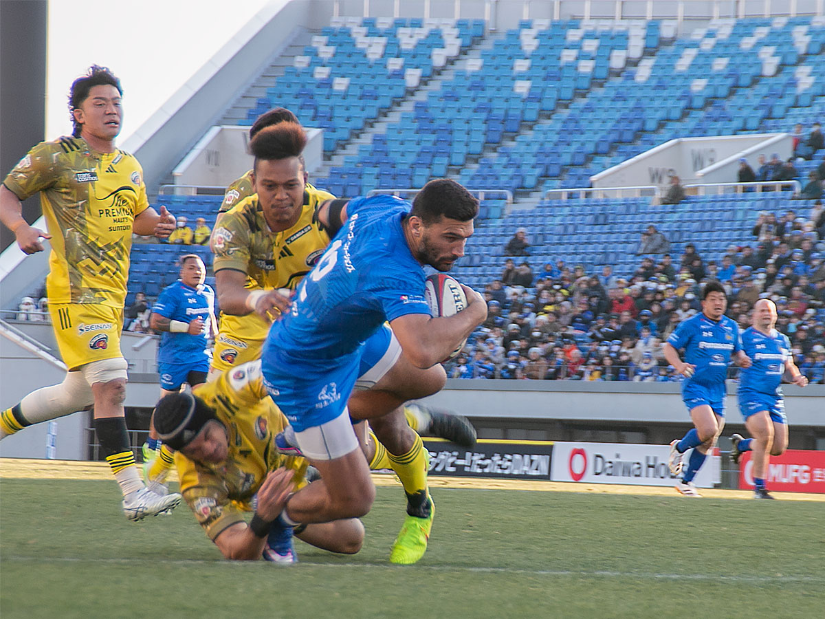 後半9分。トライに向かうダミアン・デアレンデ選手。第6節(交流戦)東京サントリーサンゴリアス戦