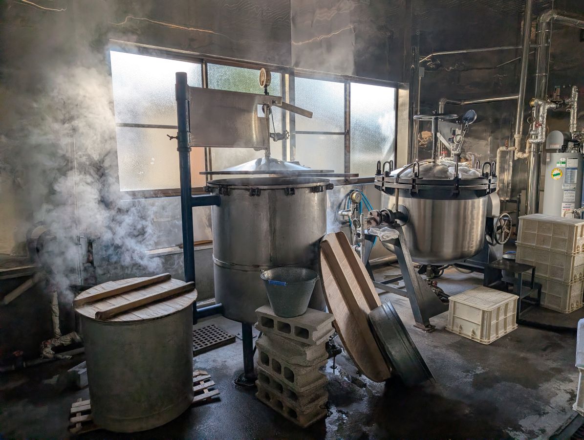 低圧窯で3時間蒸した大豆が蒸しあがる直前の製造所内