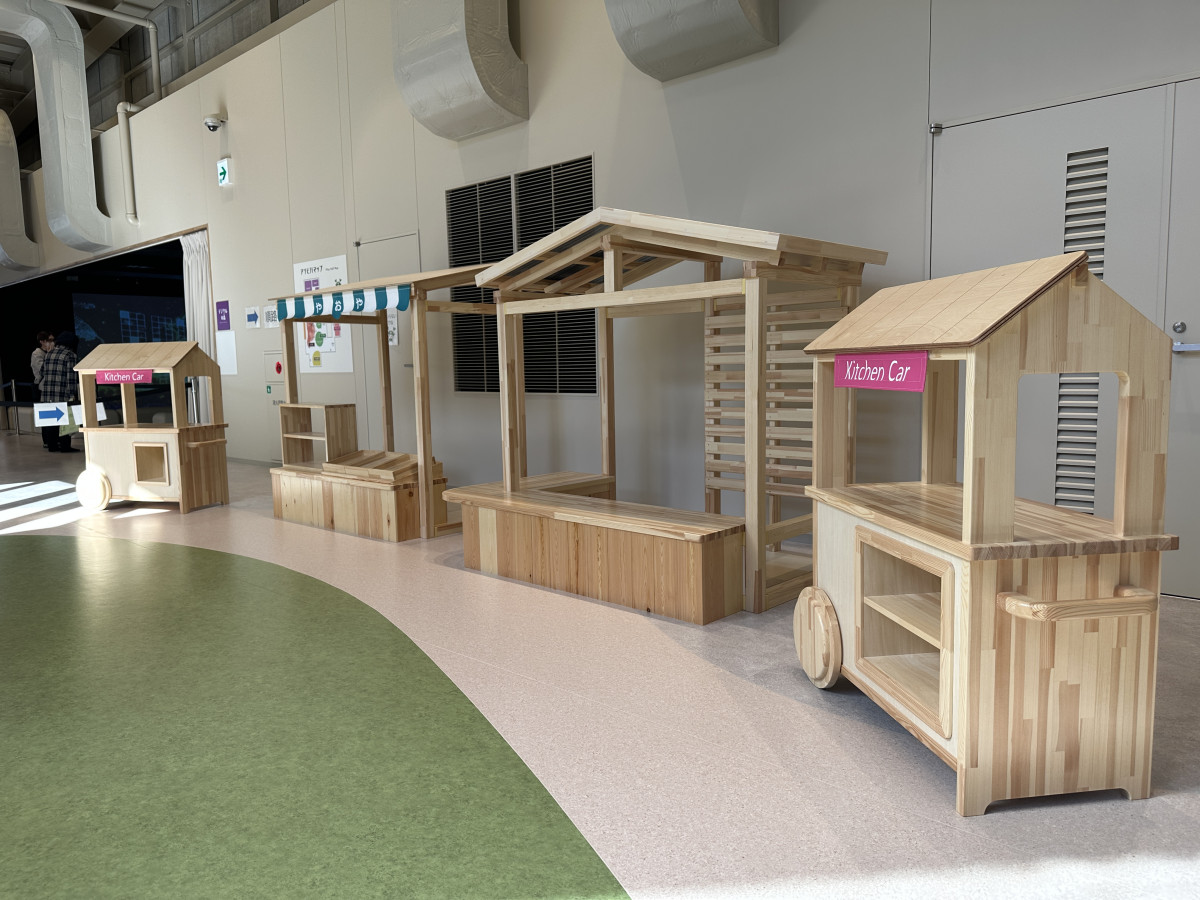 木製の屋台やキッチンカー、畑のおもちゃなどが並ぶ「ごっこひろば」