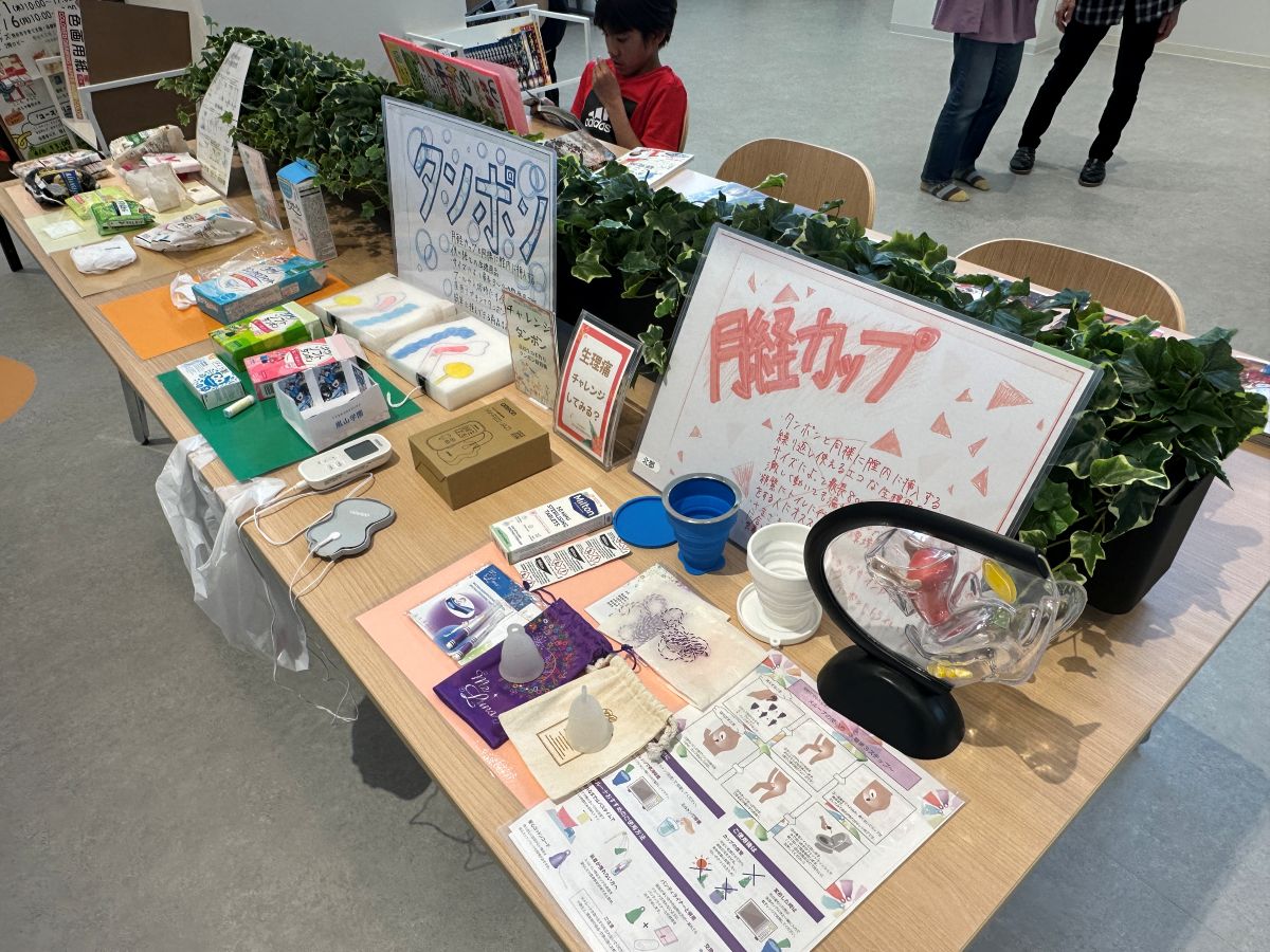 避妊に関するグッズやさまざまな生理用品などを並べた展示コーナー