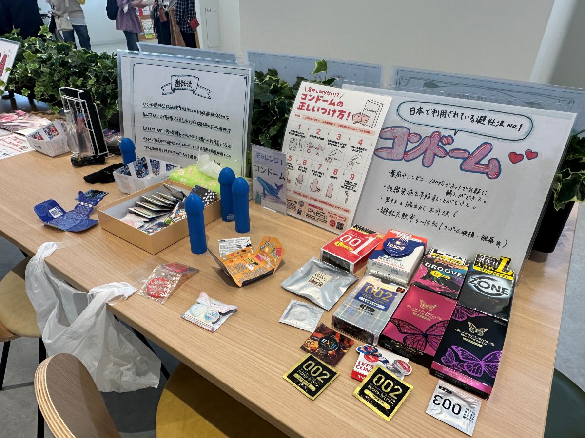 来場者が自由に手に取って見ることができる。避妊グッズやさまざまな生理用品などを並べた展示コーナー